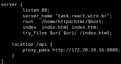 api 라우트에 대해 proxy pass 설정을 해줌. ( backend server의 8080 포트로 매핑 )