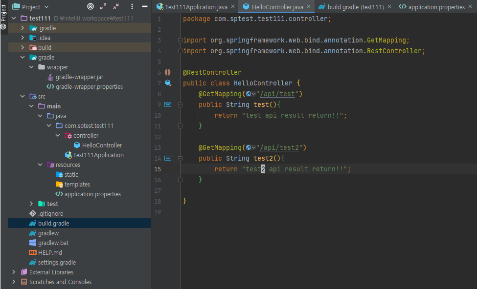 1-2. HelloController.java 작성 ( 간단한 Rest Controller를 작성합니다. )