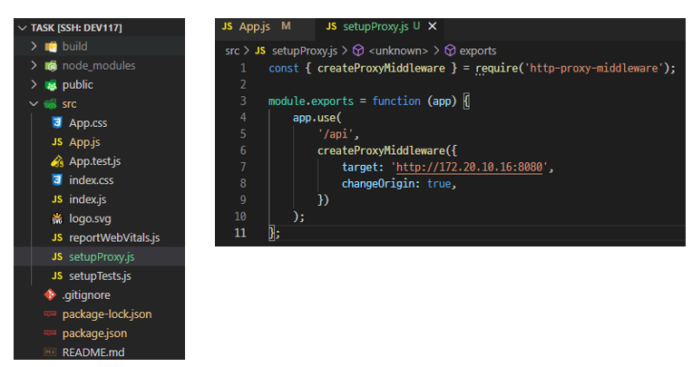 3-2. 이후 src 폴더 아래 setupProxy.js란 파일을 생성 후 아래와 같이 작성합니다.